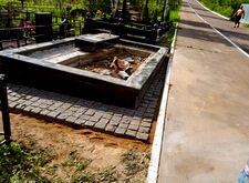 Приступаем к работе с цветниками. Один уже был в наличии, поэтому делаем второй, идентичный. По проекту цветники должны смотреться одинаково даже несмотря на то, что памятники будут разные. В это же время укладываем гранитную брусчатку уже на территорию места захоронения.